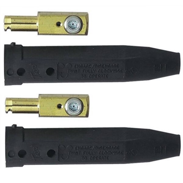 Premium Tweco/Lenco style positive cam twist-lock connectors and adapters for welding cable AWG 1/0-4/0 (50-95mm) for Miller welders. Compatible with Miller Tweco-style twist-lock connectors and adapters. For use with 1/0-2/0 (50-70mm) and 3/0-4/0 (70-95mm) welding cables. Connection via a positive cam action; cable wires secured by ball-point cable screws. 191981/218677 (male/female, 0.625" pin dia.) for AWG 1/0-2/0 (50-70mm). Choose 70-95mm connectors for 3/0-4/0 cables. 218678 is a threaded stud-to-Tweco female terminal adapter 45-deg with stud-hole 17/32" (0.531").