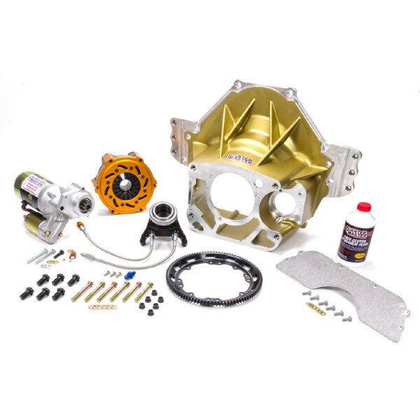 The Quarter Master® LGC (Low Ground Clearance) Bellhousing Kit maximizes downforce and lowers a vehicle’s center of gravity by allowing the nose of the car to be as low to the track as possible. The additional ground clearance is achieved through a smaller ring gear than competitors’ versions and a flat-bottom bellhousing that makes it flush with the bottom of the tightest-fitting dry-sump oil pans. The bellhousing also features both internal and external strengthening ribs to maximize strength and stiffness while reducing parasitic drag. The kit is designed for circle track or road racers using 5.5? clutches and a rear-mount starter. It can be used as a retro-fit option or an entirely new package. Quarter Master® LGC Bellhousing Kits featuring either magnesium or aluminum bellhousings are available for use with either 2- or 3-disc clutches.