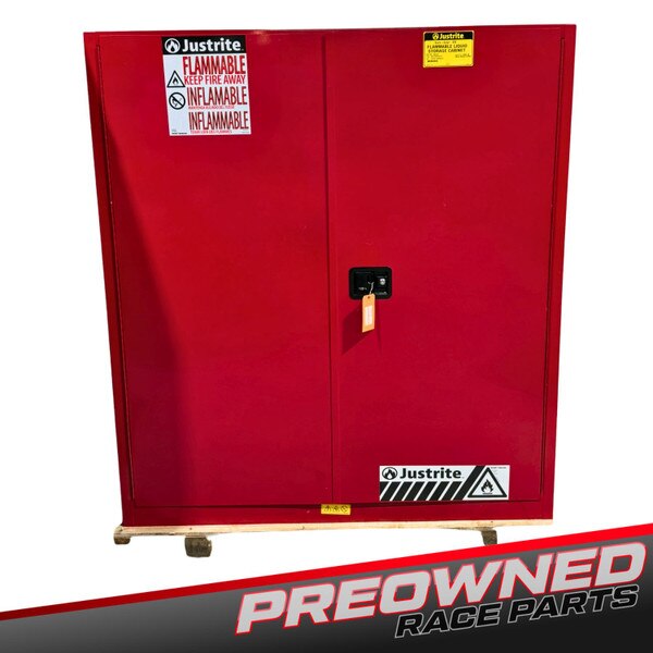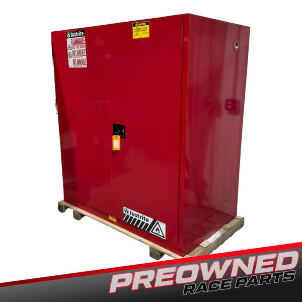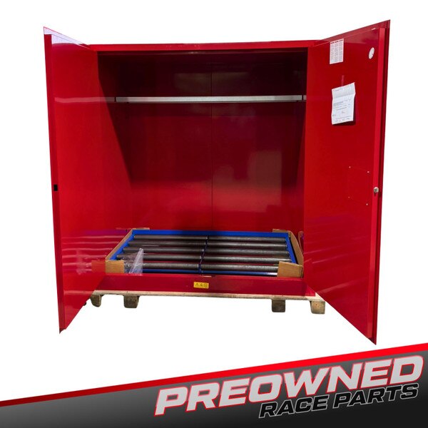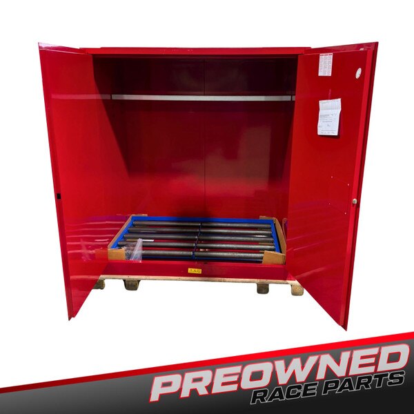 This Used 115 Gallon Vertical Drum Storage Cabinet provides a rugged, fire-resistant enclosure for storing a single vertical drum plus accessories and small containers. The manual-close, two-door design and heavy-duty steel construction make it a reliable choice for shops, race facilities, warehouses, and maintenance operations that handle flammable liquids.