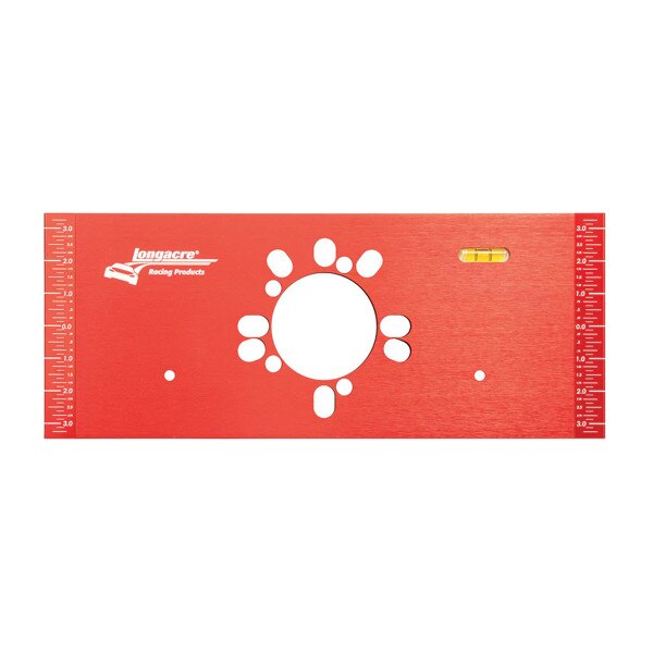 3/8" thick T6 billet aluminum wheel plate with vial and mounting holes for most 5 bolt patterns (4-1/2" - 5") and most wide 5 plus 4 bolt patterns (4-1/4" - 5"), 5 & 8 bolt drive flanges Anodized and laser engraved Center hole is 3 1/4" Fits any Longacre Bump Steer Gauge
